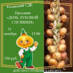 Главная / Афиша / Праздник «День луковой слезинки» Праздник «День луковой слезинки» 31 октября 2023 в 15:00 150 руб. Казанский СДК