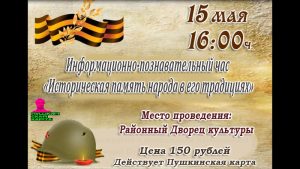 Информационно-познавательный час “Историческая память народа в его традициях” 15 мая в 16:00 150 руб. Районный Дворец культуры