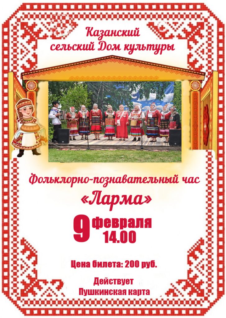 Фольклорно-познавательный час «Ларма». 9 февраля 2025 в 14:00 21 февраля 2025 в 16:00 200 руб. Казанский СДК