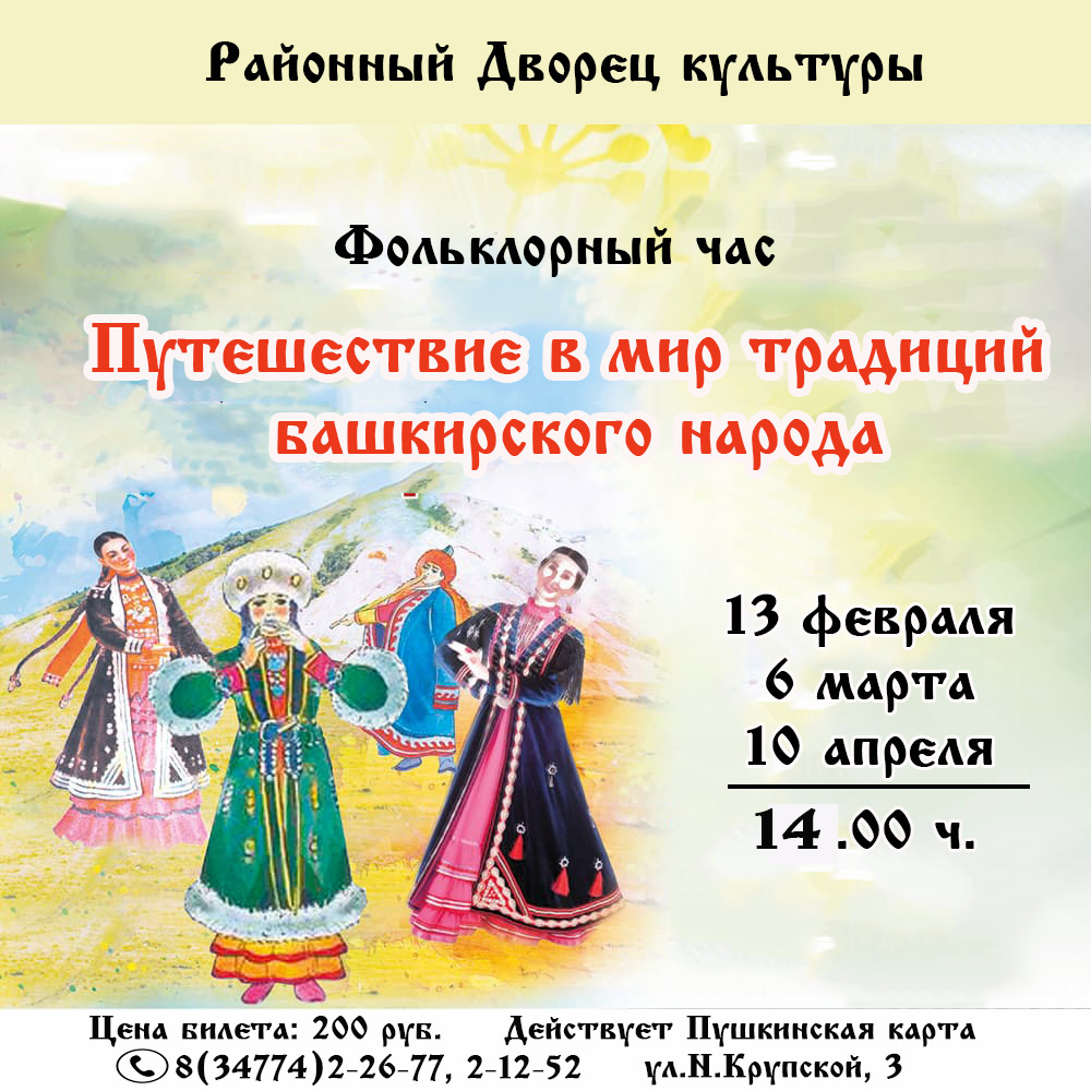 Фольклорный час «Путешествие в мир традиций башкирского народа» 13 февраля 2025 в 15:00 6 марта 2025 в 15:00 10 апреля 2025 в 15:00 200 руб. Районный Дворец культуры