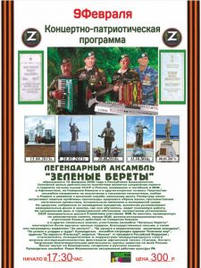 Концертно-познавательная программа «Зеленые береты» 9 февраля 2023 в 17:30 300 руб. Районный Дворец культуры