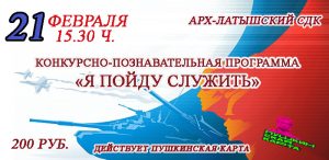 Конкурсно-познавательная программа “Я пойду служить” 21 февраля 2023 в 15:30 200 руб. Арх-Латышский СДК