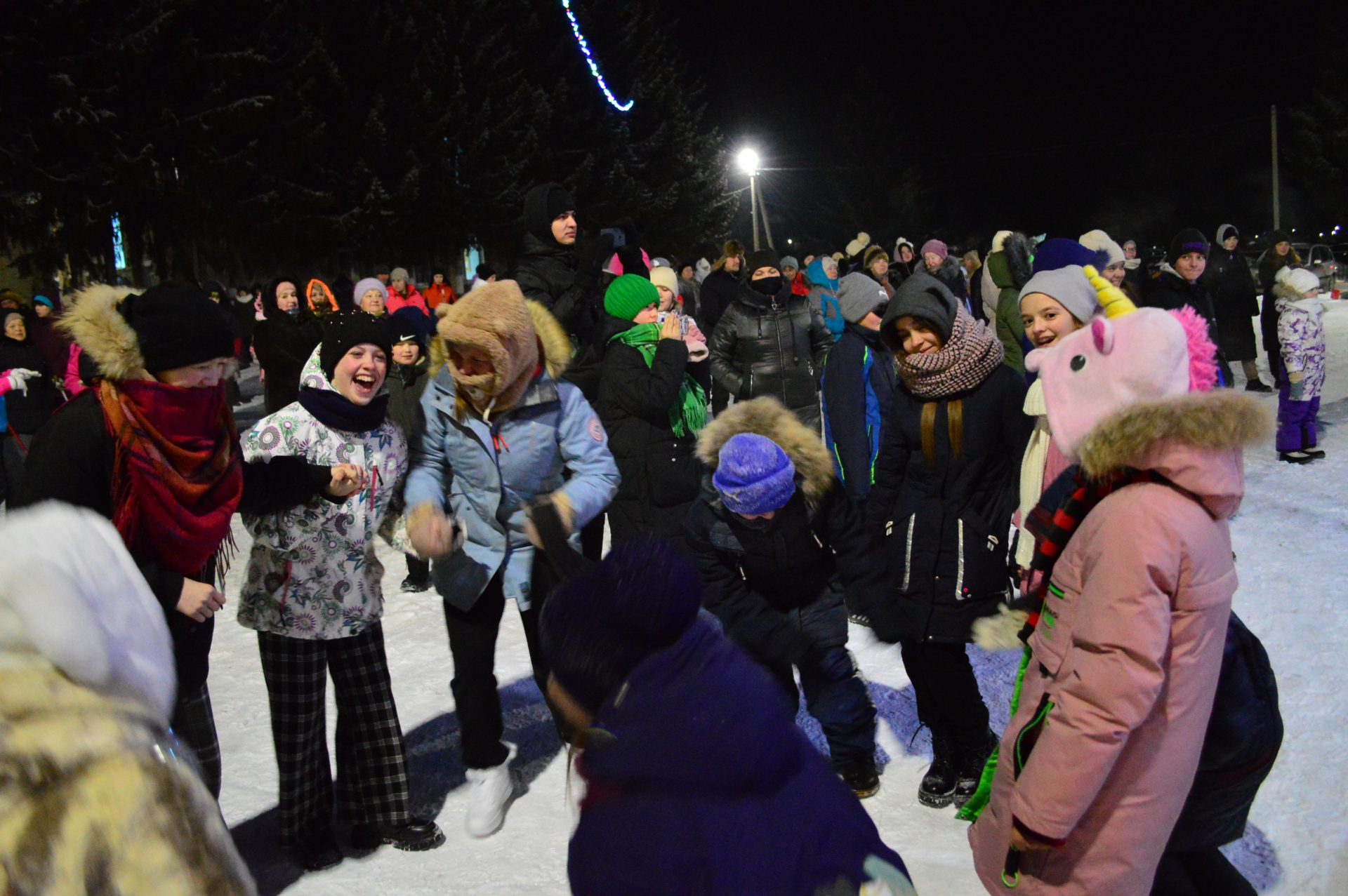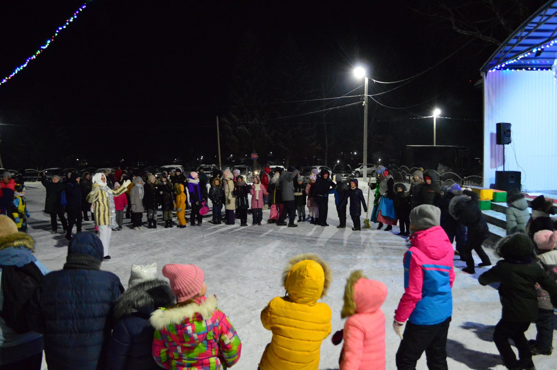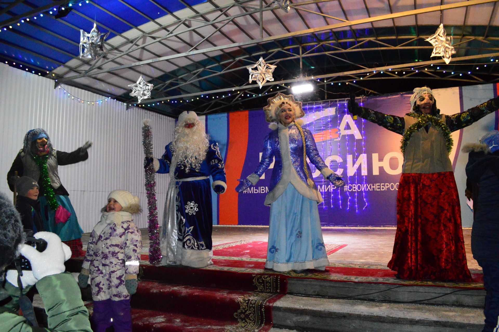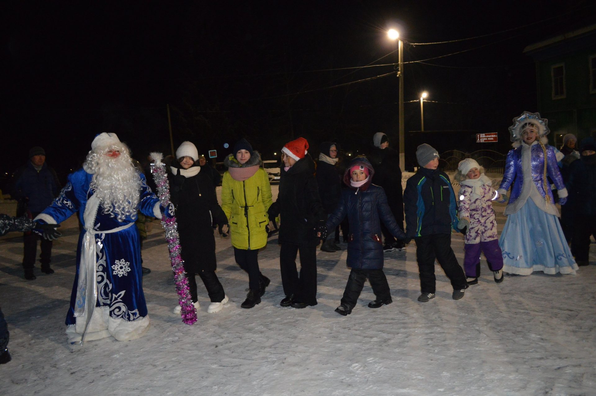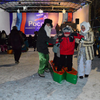 Далее, работники Районного Дворца культуры увлекли гостей праздника интересной инсценировкой, зимними играми и забавами, новогодними плясками и хороводом. Десятки сказочных персонажей сделали этот праздник весёлым и незабываемым. Все желающие могли сделать с любимыми героями фотографию на память.