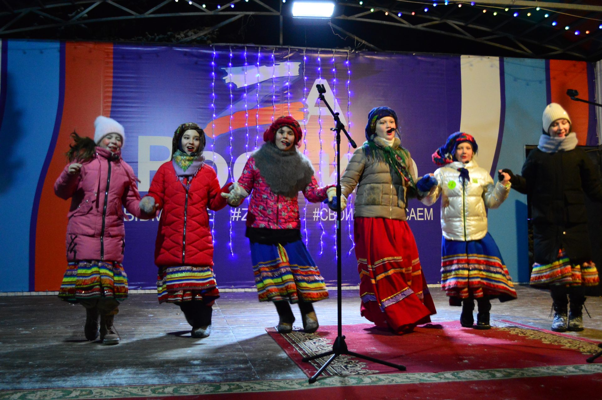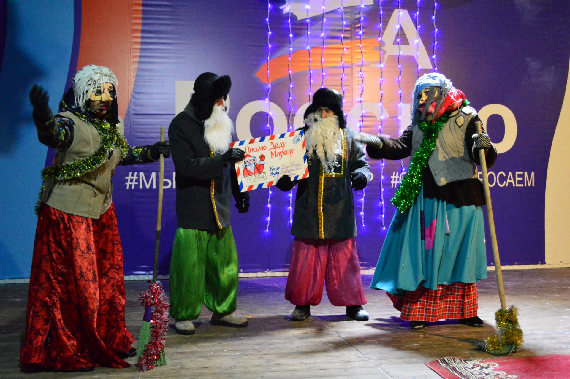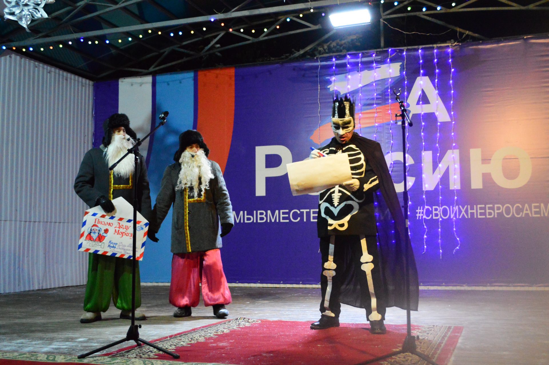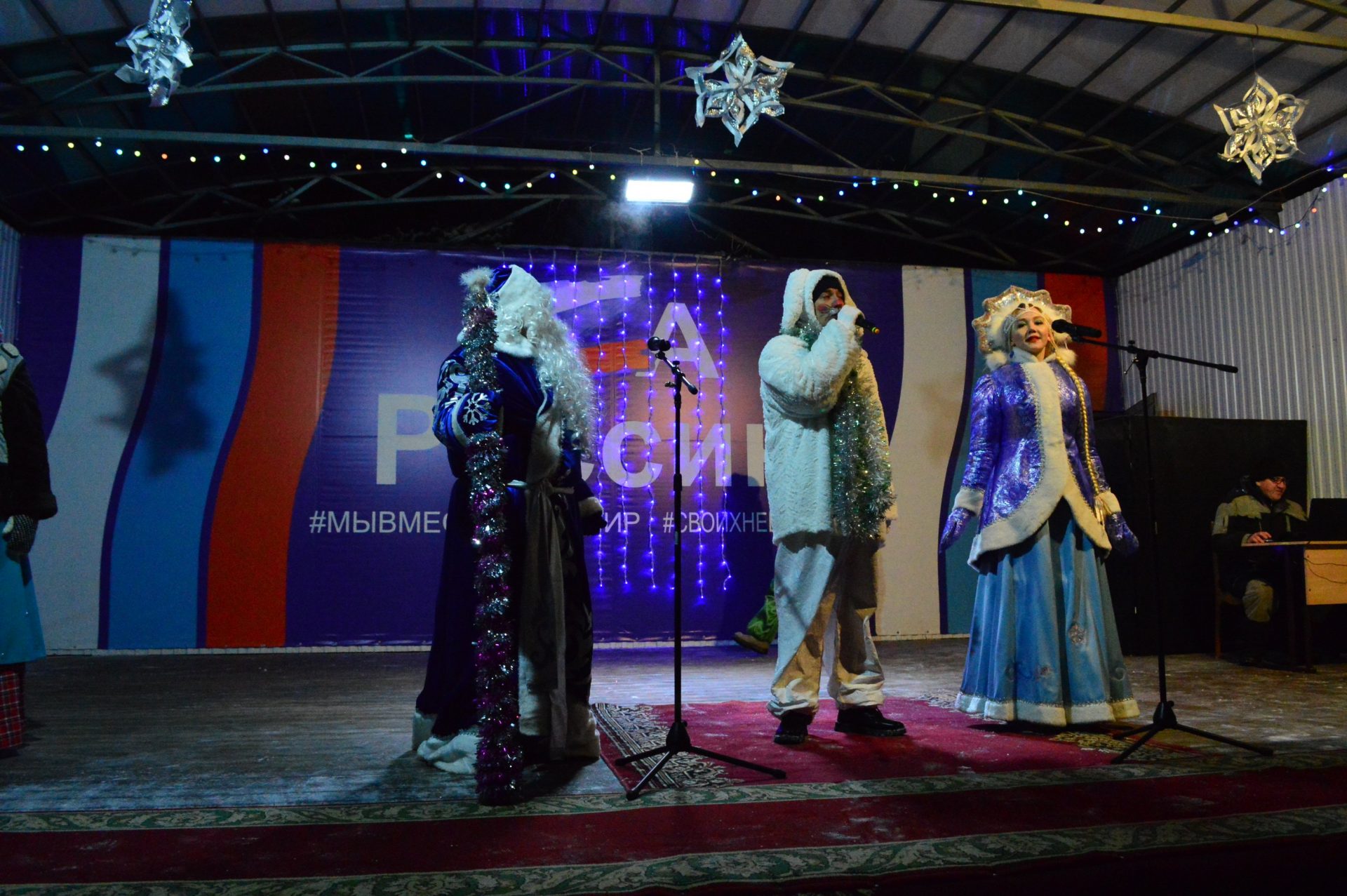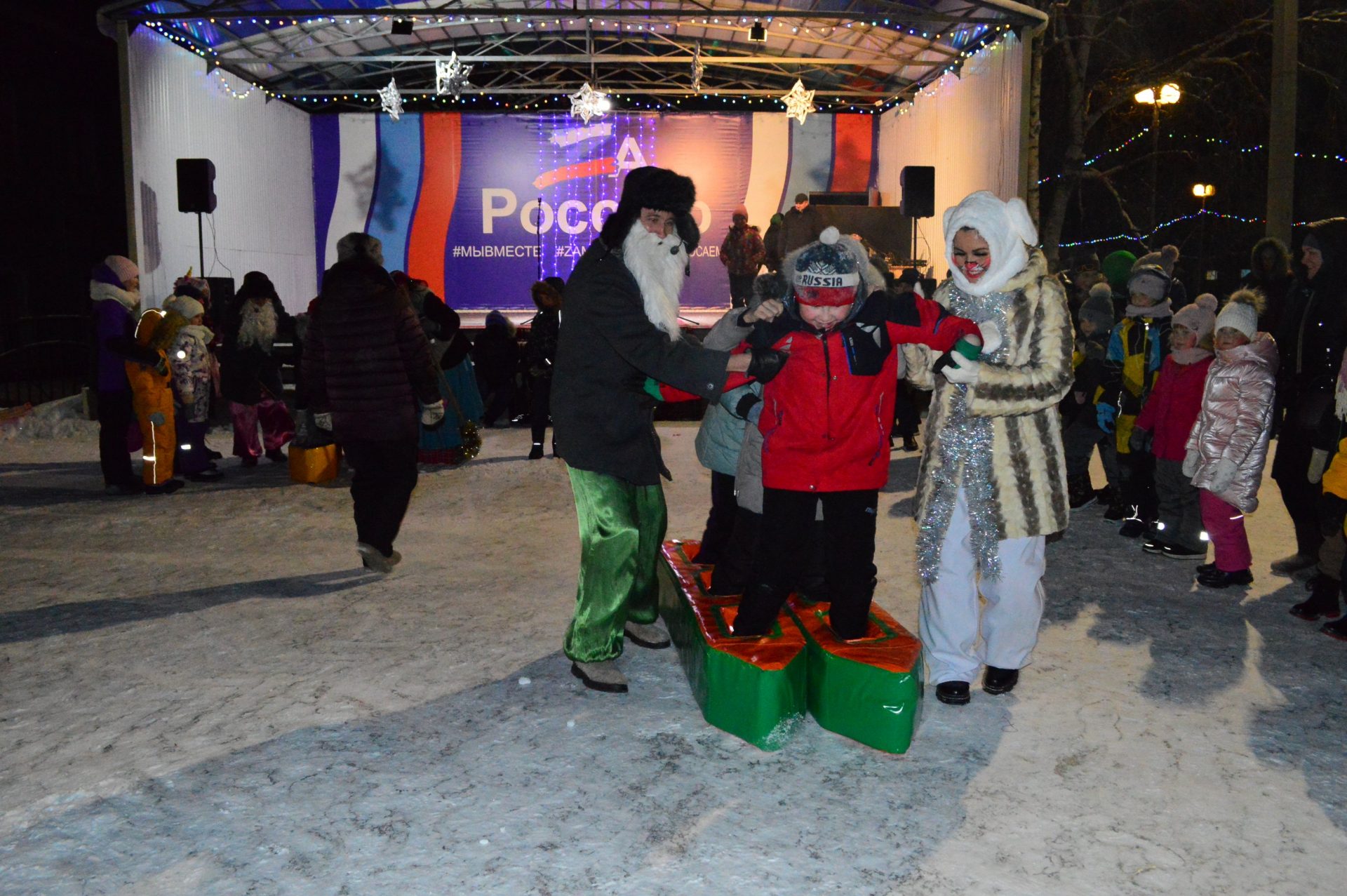 Далее, работники Районного Дворца культуры увлекли гостей праздника интересной инсценировкой, зимними играми и забавами, новогодними плясками и хороводом. Десятки сказочных персонажей сделали этот праздник весёлым и незабываемым. Все желающие могли сделать с любимыми героями фотографию на память.