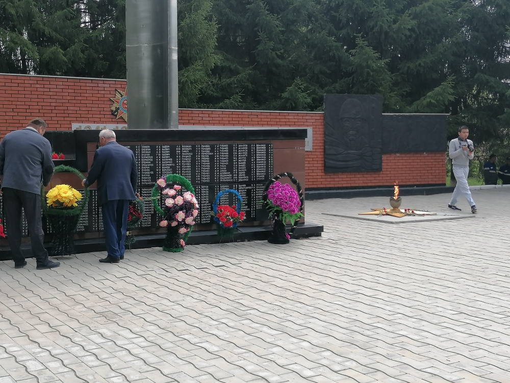 Участники митинга, после минуты молчания в память погибших и умерших участников Великой Отечественной войны, возложили венки и цветы к памятнику павшим в Великой Отечественной войне.