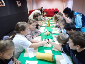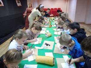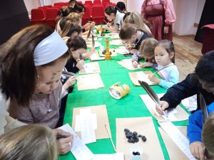 Екатерина Лежнева и Расиля Иштуганова подготовили для детей чернила, угольки, лощеную бумагу, бересту, перья и вместе с художником Ляйсан Вагаповой провели мастер-класс по написанию текста старо-славянским шрифтом.