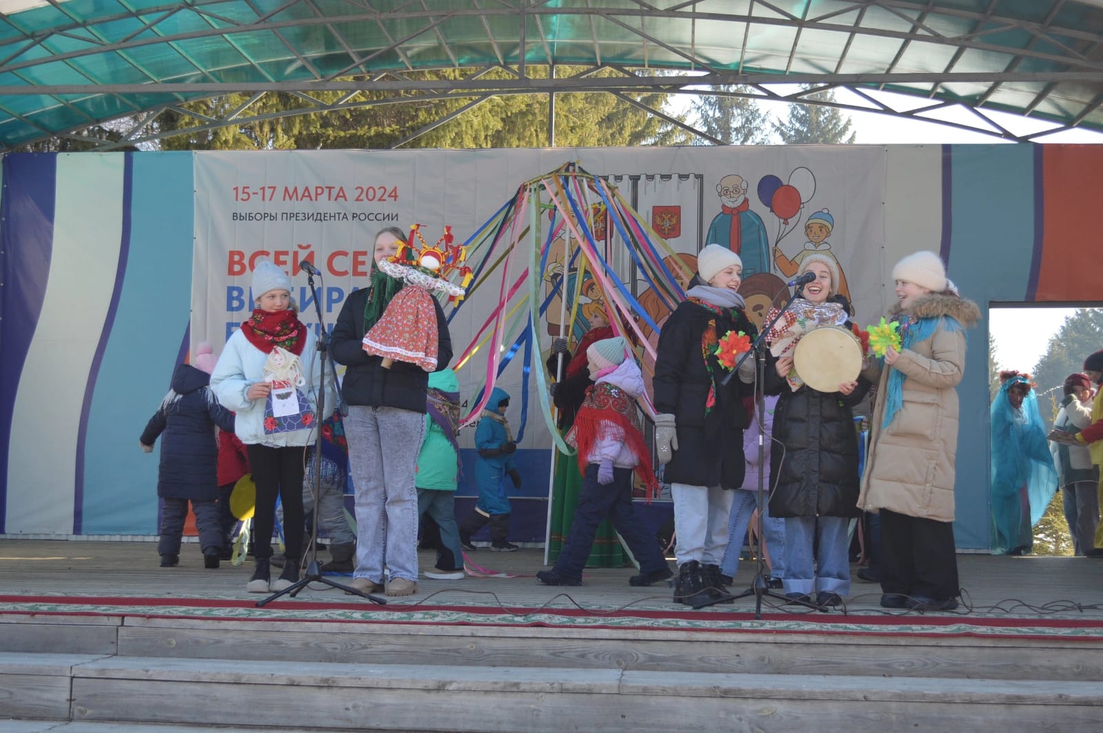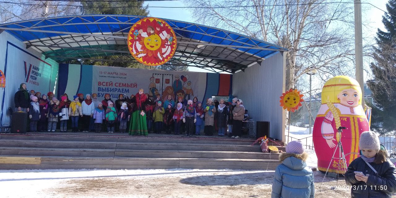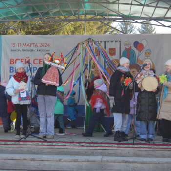 Сегодня, на площади перед Районным Дворцом культуры прошло народное гуляние «Широкая Масленица». В этом году празднование Масленицы совпало с завершающим днем выборов Президента Российской Федерации. Многие люди выходя с избирательного участка РДК, сразу попадали на развеселую Масленицу.