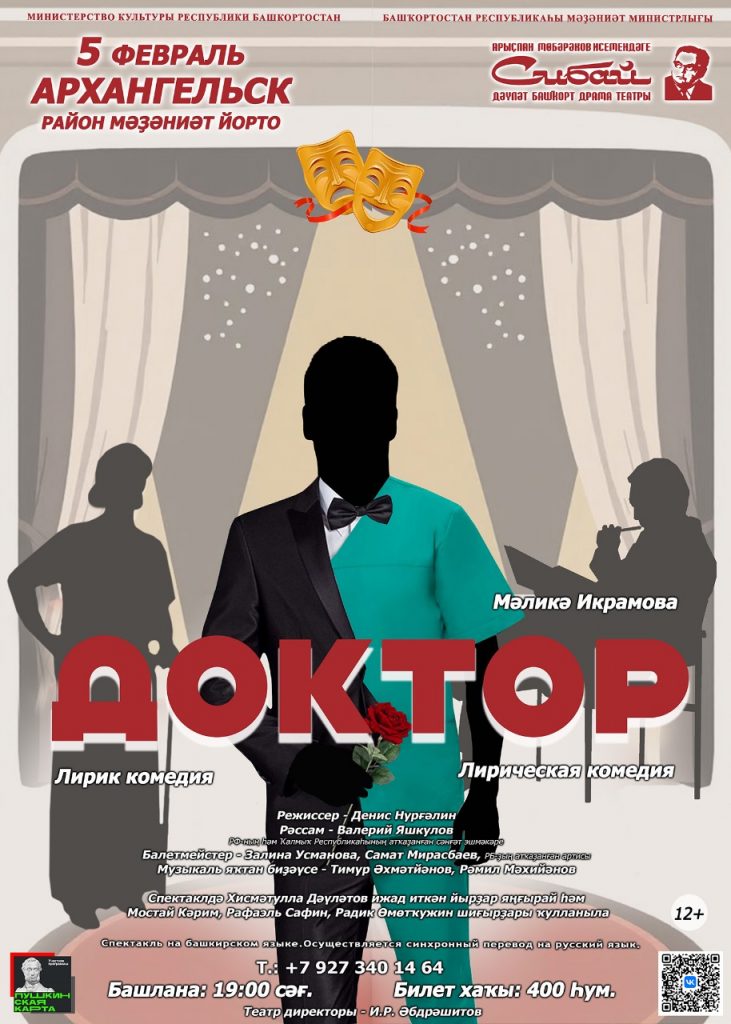 5 февраля в 19.00 часов в Районном Дворце культуры состоится лирическая комедия «Доктор» (М. Икрамова, режиссер Денис Нургалин) Сибайского государственного башкирского театра драмы имени Арслана Мубарякова. 12+