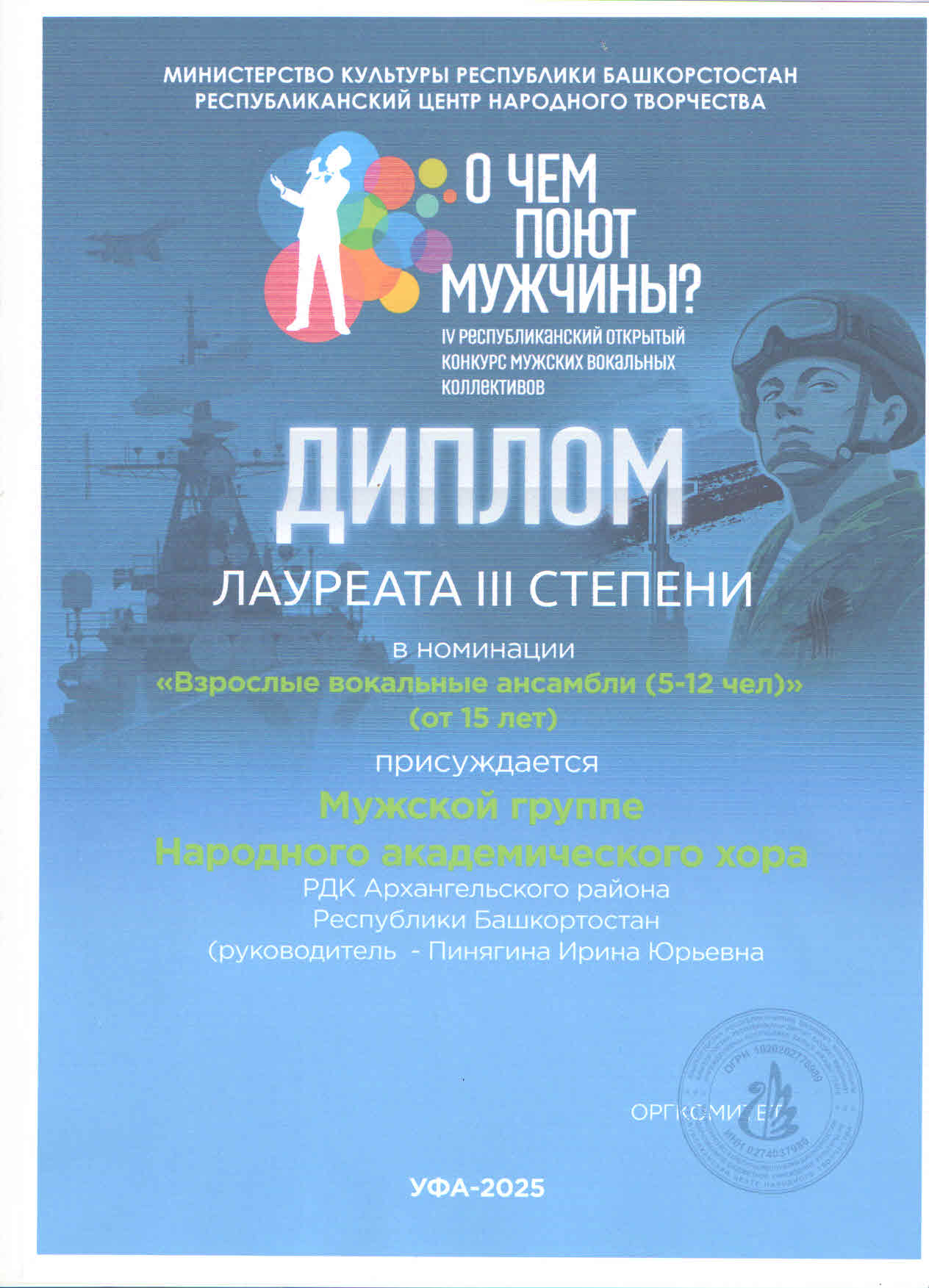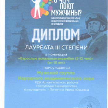 Наша мужская группа народного академического хора РДК под руководством Ирины Пинягиной также приняла участие в этом значимом событии. С волнением и гордостью мы вышли на сцену, готовые поделиться своим искусством. И, как результат наших стараний, мы завоевали почетное звание Лауреата III степени и были награждены денежным сертификатом. Этот успех стал не только наградой за наши усилия, но и подтверждением того, что традиции и культура продолжают жить в сердцах людей.