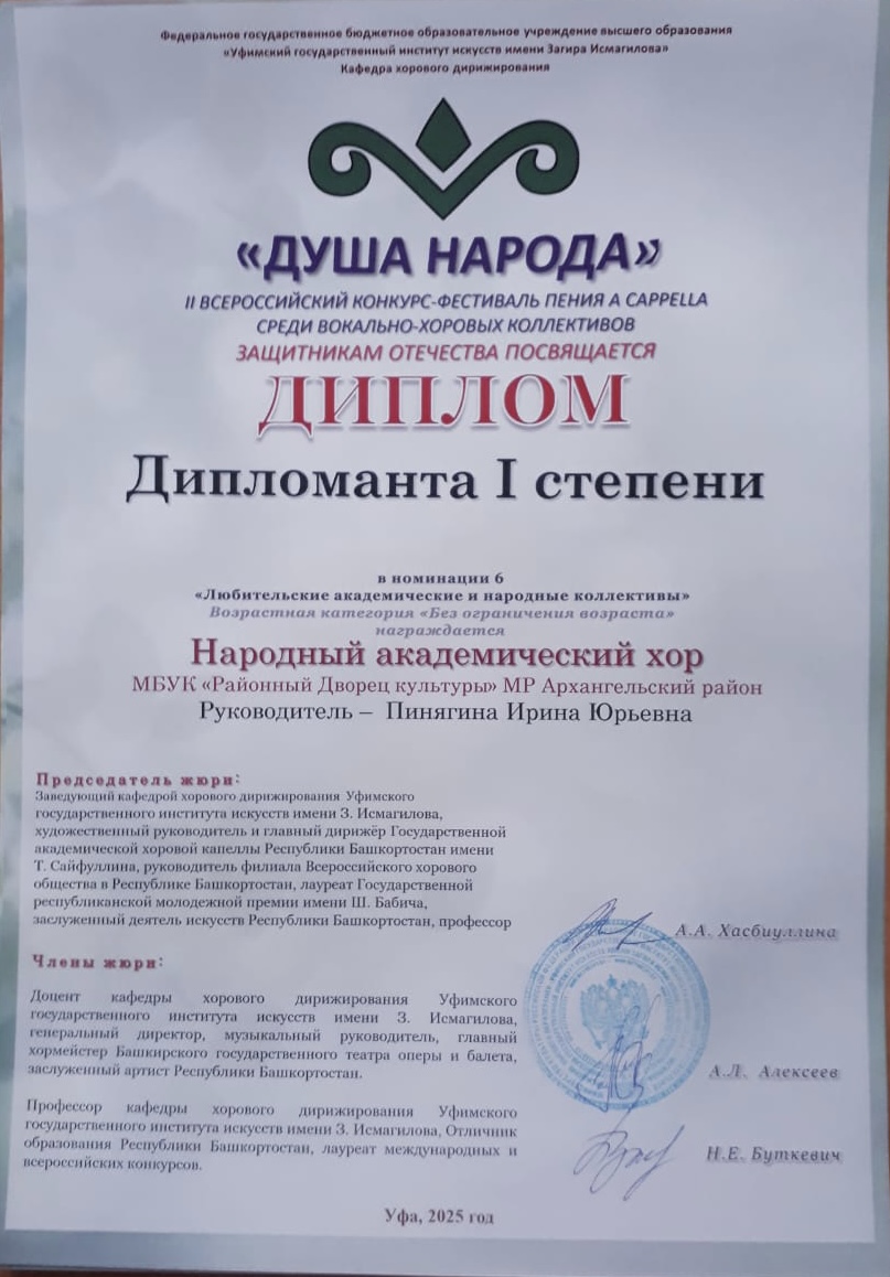 От всей души поздравляем Народный академический хор МБУК «Районный Дворец культуры» муниципального района Архангельский район и его талантливого руководителя Пинягину Ирину Юрьевну с этим замечательным достижением! Ваш успех — это гордость для всего Архангельского района и подтверждение высокого уровня музыкального искусства в нашем регионе. Желаем дальнейших творческих побед и неиссякаемого вдохновения!