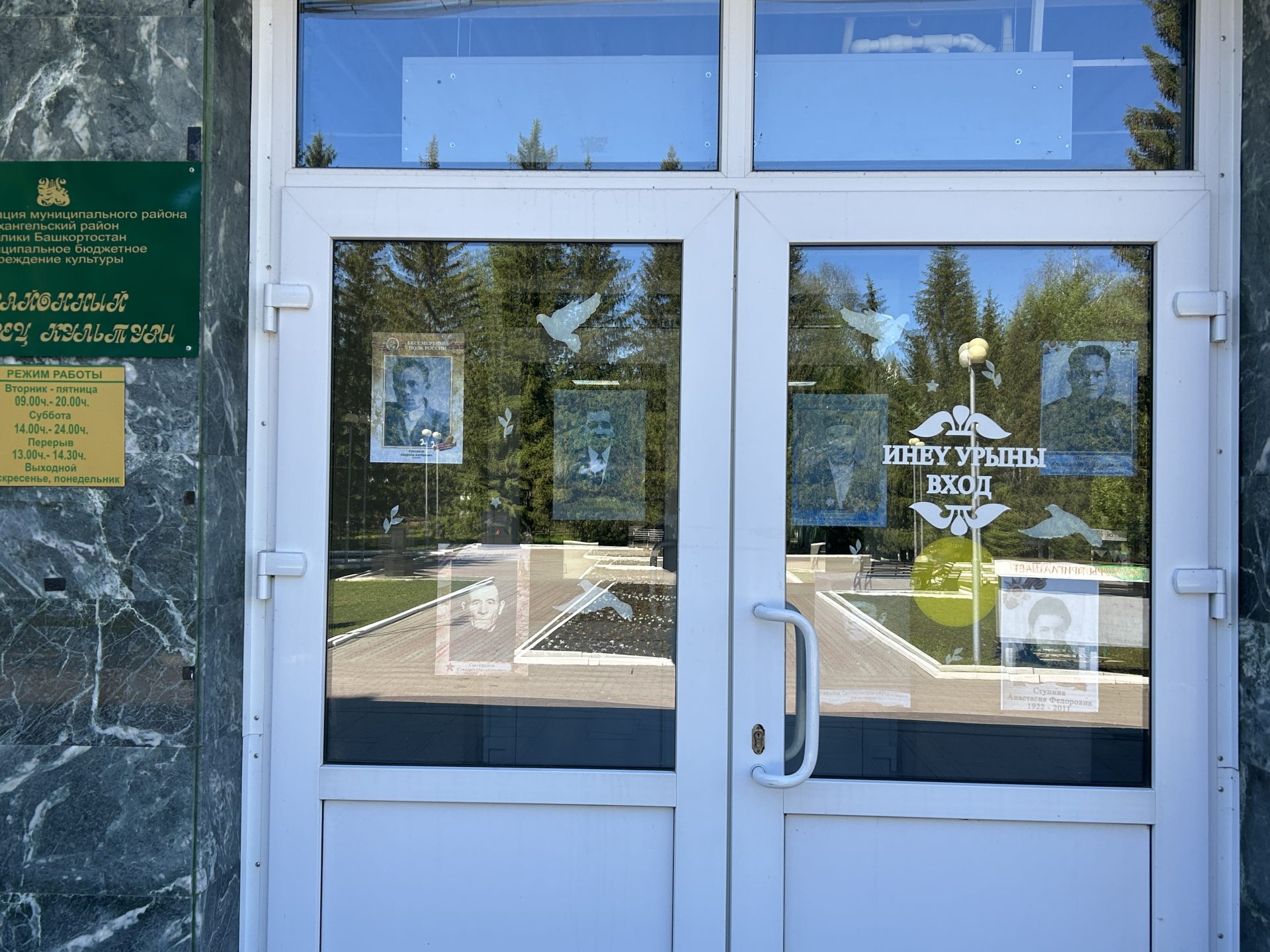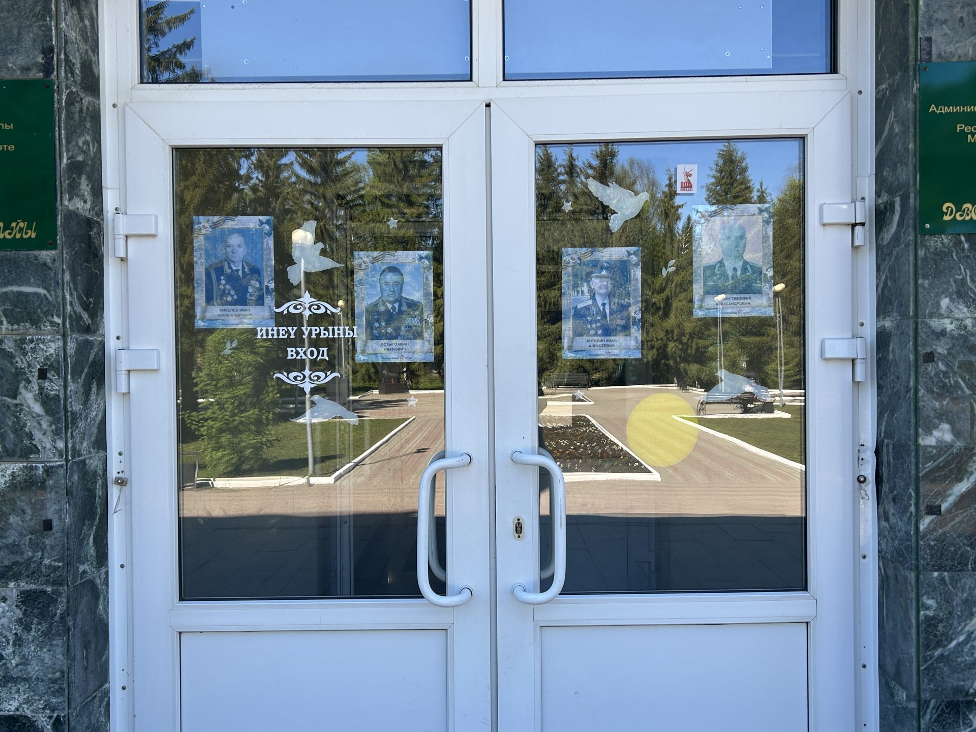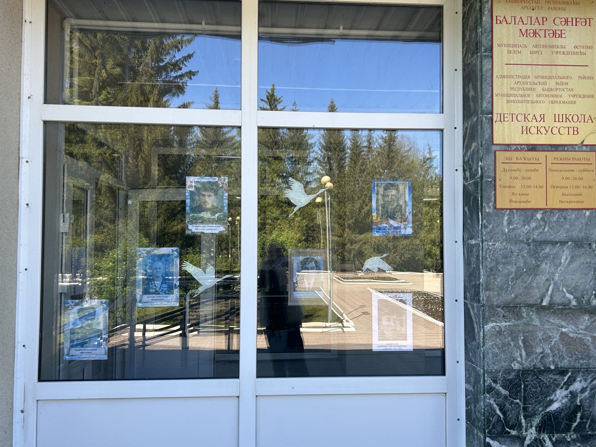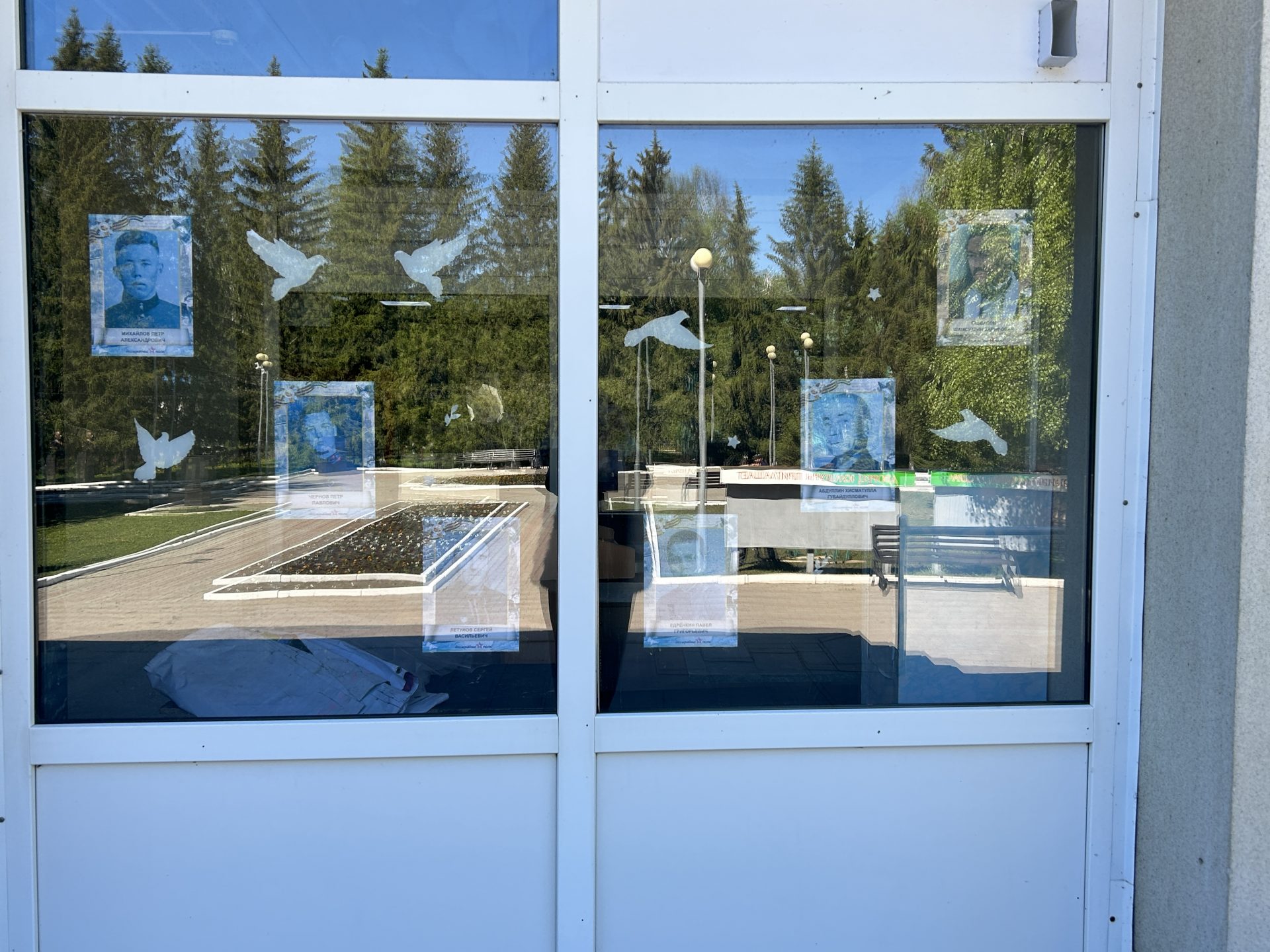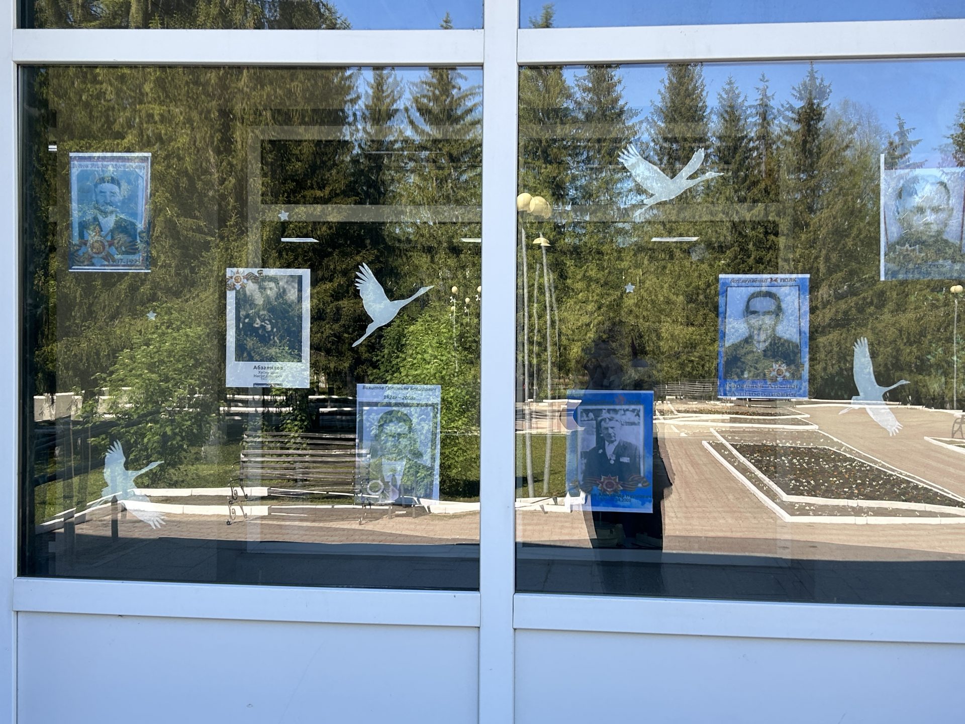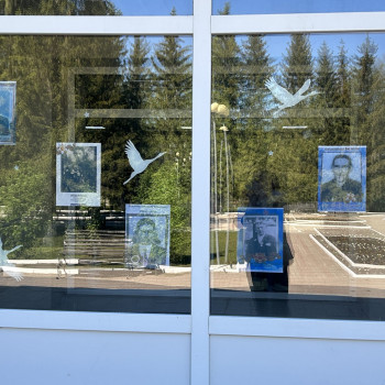 Помимо фотографий, окна РДК украсили бумажные силуэты голубей, журавлей и звездочки.  Эти символы мира, надежды и победы, красочно и трогательно дополнили общую картину.  Они напоминают нам о том, что цена победы была высока, но мир, завоёванный ценой бесчисленных жертв, бесценен.