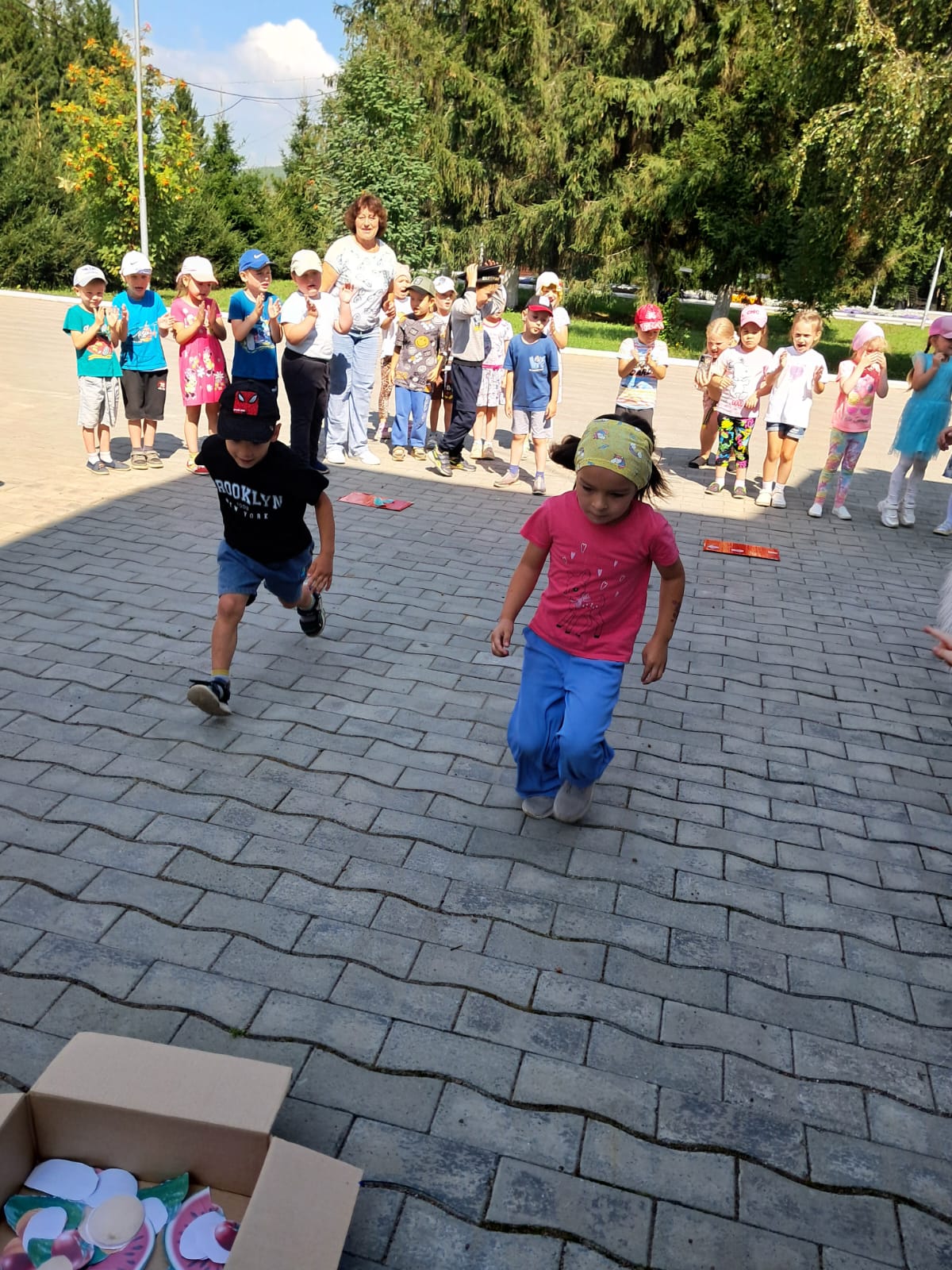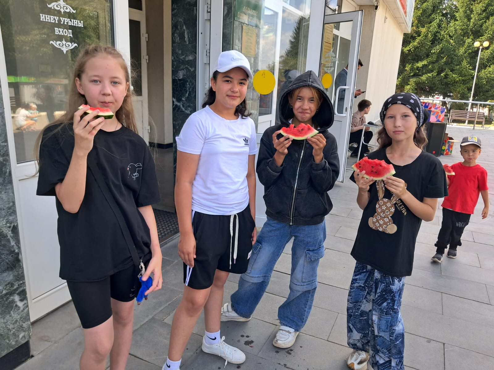 Но самым главным и желанным лакомством, конечно же, был арбуз!  Сладкий и сочный, он утолял жажду в этот жаркий день, даря ощущение летнего праздника.  Дети с удовольствием делились арбузом друг с другом, создавая атмосферу дружбы и единения.